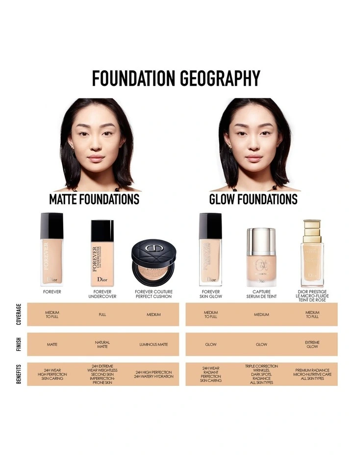 DiorForever Couture Perfect Cushion is available in a range of shades, speciallydeveloped to match skin tones and bring out their natural glow. Its luminousmatte finish is perfect for any skin type.                  Â