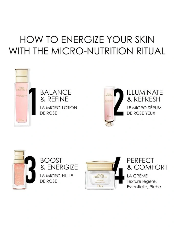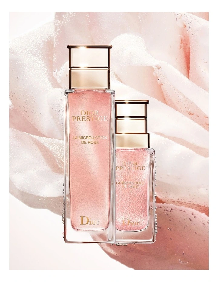 The Dior Prestige micro-nutritive lotion enriched with minerals and Rose de Granville oil for a sensation of intensely purified skin and lasting comfort. Brimming with micro-nutrients, skin is hydrated for 24 hours,** infinitely pure and fresh. La Micro-Lotion de Rose is the first step before La Micro-Huile de Rose for deeply balanced skin that seems as if clarified; perfectly prepared for the rest of this exceptional ritual.