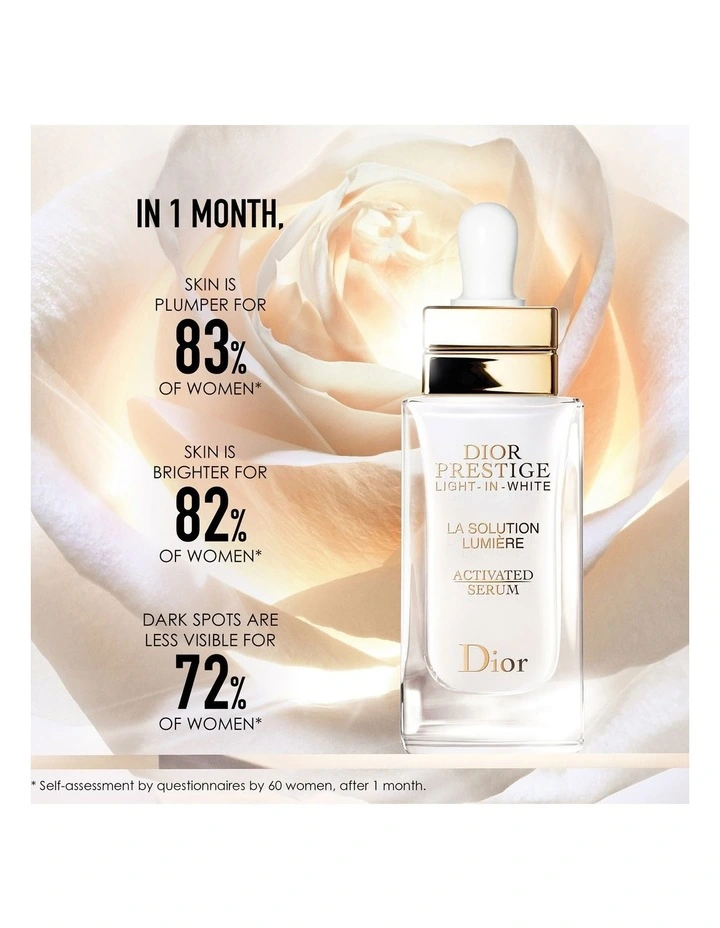 ** Dior Prestige Light-in-White La Solution Lumire Activated Serum concentrates the power of dual illuminating and soothing effectiveness. Applying the product to the skin creates a true moment of pleasure and sensoriality, thanks to its fresh, lightweight texture that envelops the skin in absolute comfort. The serum gently penetrates the skin, leaving a velvety feel. SKIN TONE PURITY & LUMINOUS INTENSITY